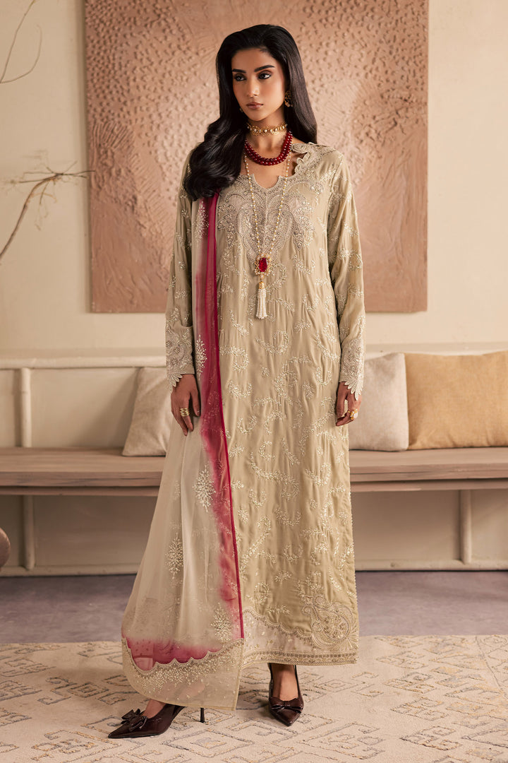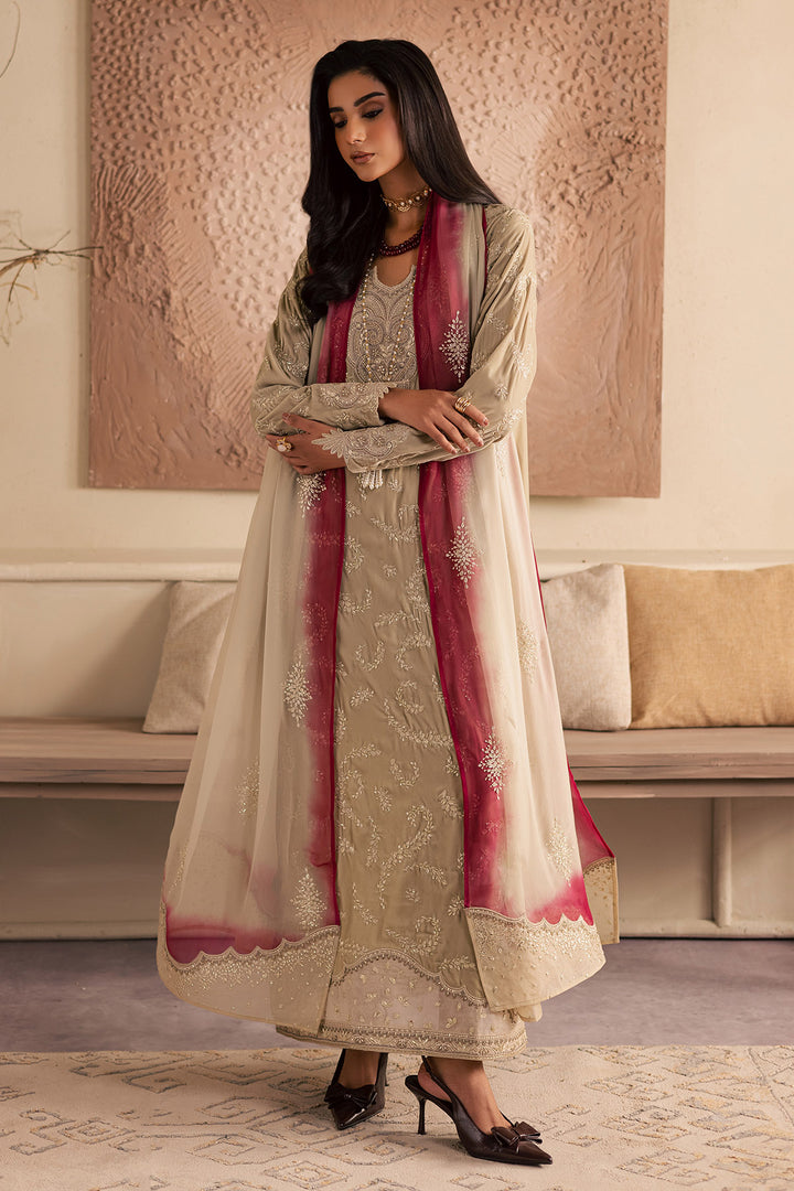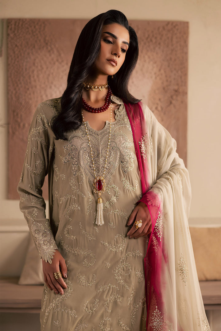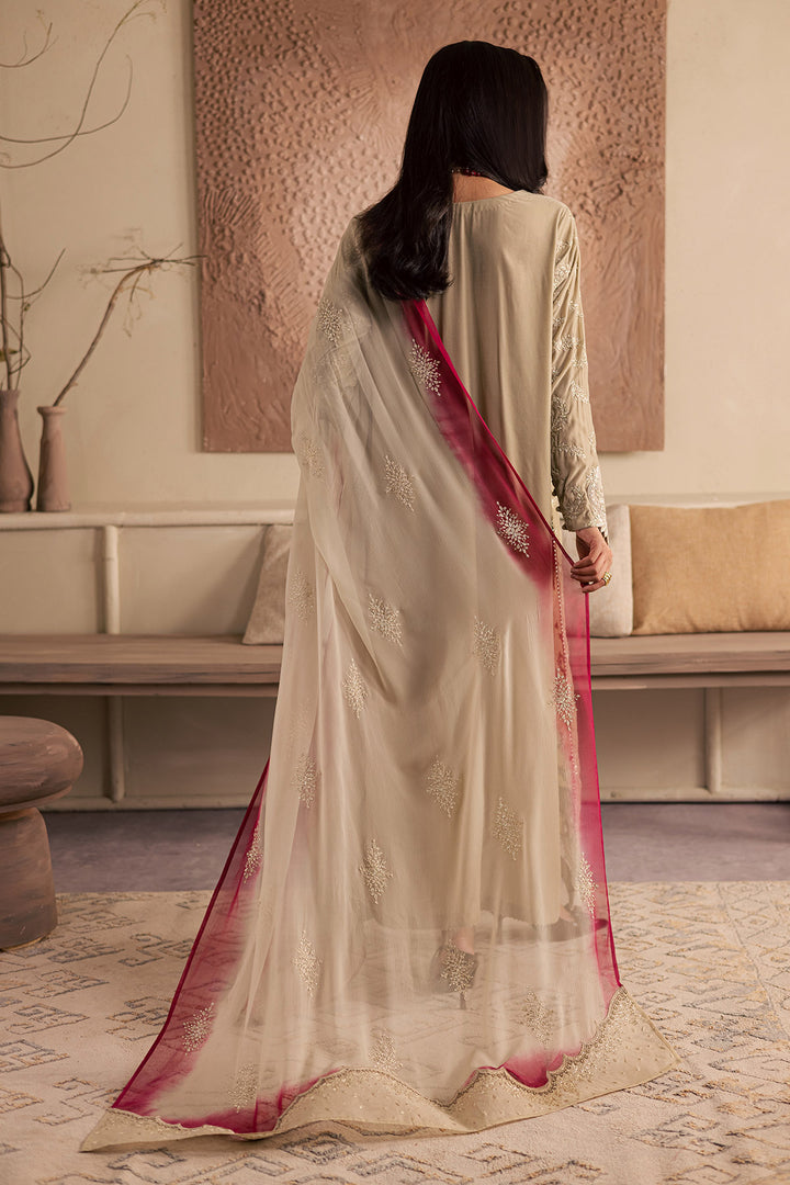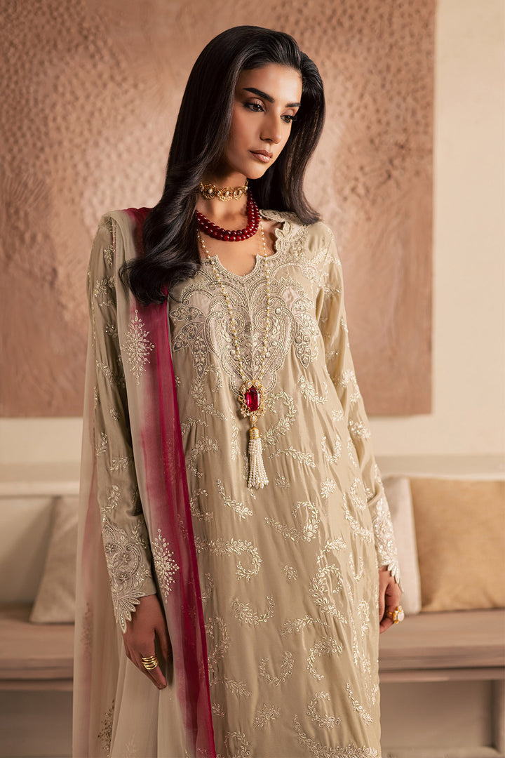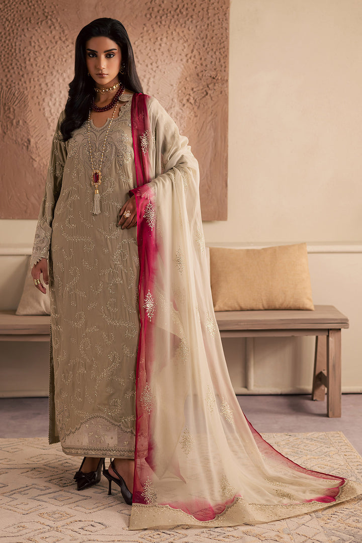 - EMBROIDERED VELVET SHIRT PAIRED WITH EMBROIDERED CHIFFON DUPATTA AND RAWSILK TROUSER