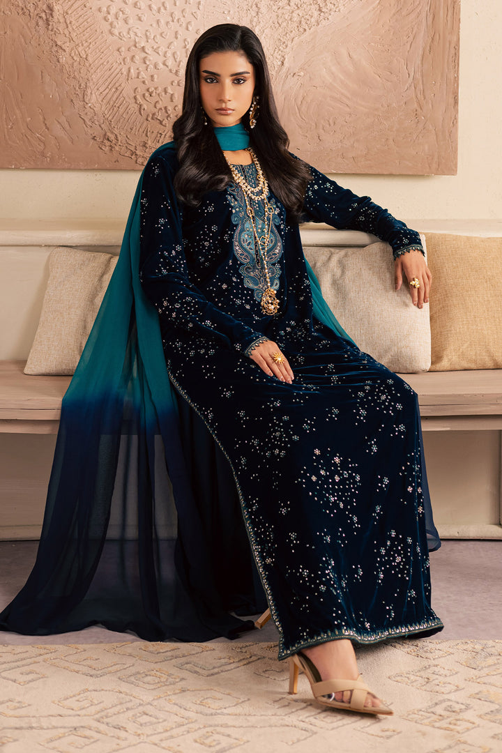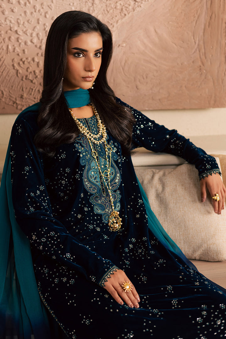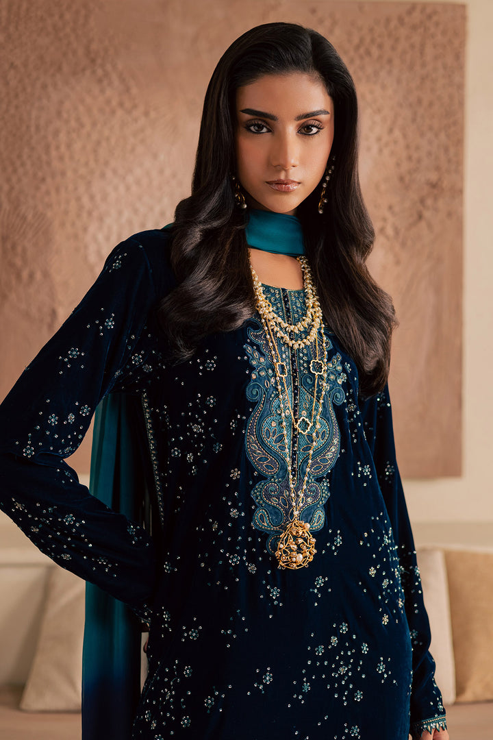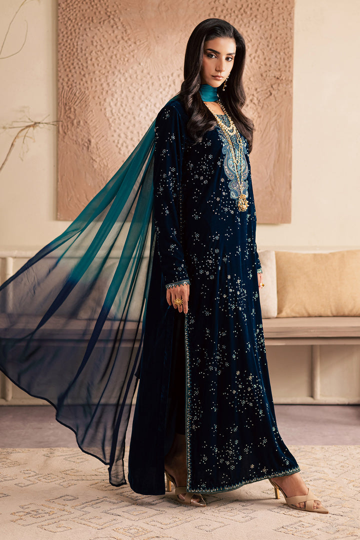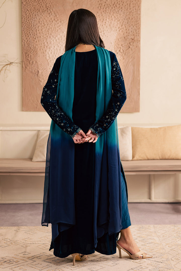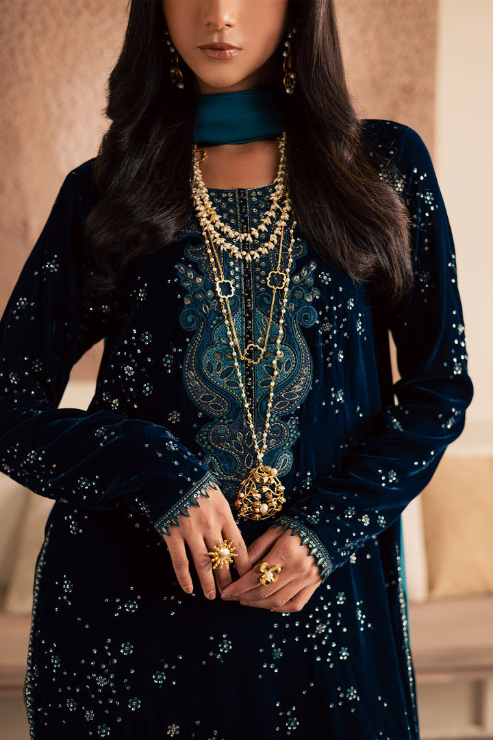 - EMBROIDERED VELVET SHIRT PAIRED WITH CHIFFON DUPATTA AND RAWSILK TROUSER